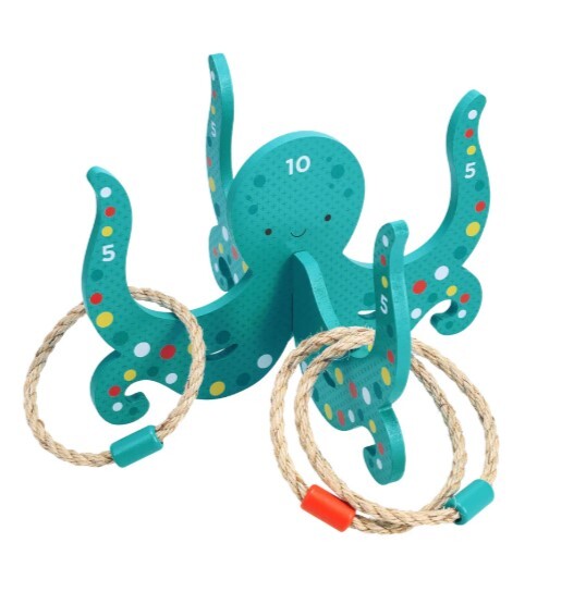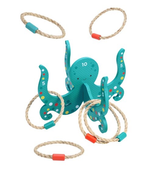 Šis rotaļīgais astoņkājis kļūs par uzmanības centru šajā klasiskās riņķu mešanas spēles versijā. Vienkārši saliec koka detaļas kopā — instrumenti nav nepieciešami — un met riņķi! Iegūsti piecus punktus, ja riņķis iekrīt uz rokas, vai desmit punktus, ja trāpa pa galvu.