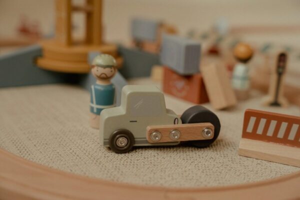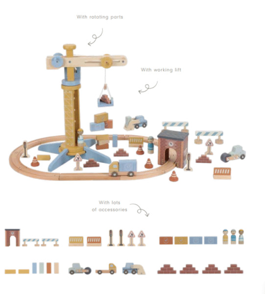 Palīdzi uzbūvēt pamatus jaunai mājai! Šis koka ceļamkrāns droši paceļ kravas un nolaiž tās. Little Dutch ceļamkrānu komplektā ietilpst viss veiksmīgai būvniecībai- būvmateriāli, transportlīdzekļi, strādnieki un ceļa zīmes. Lieliski piemērots mazajiem būvētājiem un viegli kombinējams ar XL vilciena sliedēm!