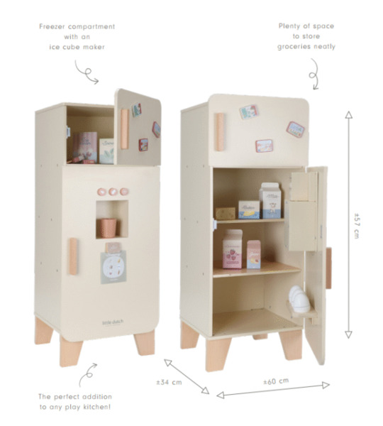 Saglabājiet savu ēdienu svaigu šajā skaistajā koka ledusskapī no Little Dutch! Ledusskapim ir ērts saldētavas nodalījums,iebūvēts ūdens un ledus aparāts, olu statīvs. Lielisks papildinājums, lai lomu spēles rotaļu virtuvē padarītu vēl reālistiskākas. Ar šo ledusskapi bērni var stundām ilgi izklaidēties, spēlējoties, vienlaikus mācoties par ēdienu un tā konservēšanu. Lielisks p