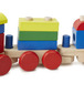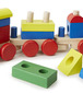 Spēļu lokomotīve ar 2 vagoniņiem, uz kuriem ir salikti dažādas krāsas un formas kluči ar kuriem var spēlēties daž ne dažādos veidos-būvēt mājas, tuneļus, vest ar vilcienu u.c.