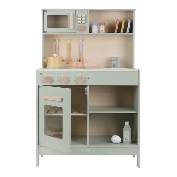 Ko mums šodien gatavo mazais šefpavārs? Palutiniet savu ģimeni vai savas iecienītākās lelles un mīkstās rotaļlietas ar gardu mājas maltīti. Cepiet gardu kūku cepeškrāsnī, pagatavojiet svaigus dārzeņus uz plīts vai apcepiet olu pannā. Ar pannu, katlu un virtuves piederumiem jūs varat praktizēt ēst gatavošanu, lai kļūtu par īstu šefpavāru meistaru! Šī stilīgā un skaistā virtuve piedāvā visu, ko vien varat iedomāties.