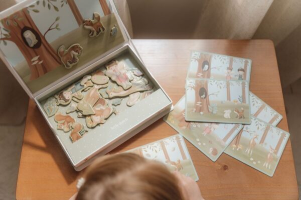 Šajā magnētiskajā spēlē var atdarināt aktivitātes, kas atrodas uz rotaļu dēlīša esošajām kārtīm, vai ļaut vaļu iztēlei un radīt savu meža piedzīvojumu. Ar magnētisko rotaļu dēli sava unikālā stāsta izveide ir pavisam vienkārša. Ir bezgalīgi daudz dažādu kombināciju, kas garantē jautru spēlēšanās laiku, vienlaikus attīstot vārdu krājumu, radošumu un koordin