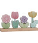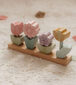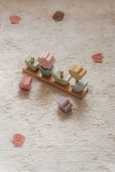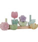 Būvēsim kopā skaistu ziedu dārzu! Sajauc un saskaņo klucīšus, lai izveidotu četrus burvīgus ziedus rindā. Novieto tos pa vienam uz statīva un vingrini roku–acu koordināciju.