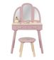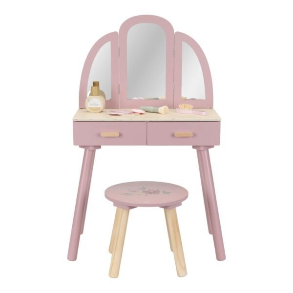 Elegantais trīs paneļu spogulis ļauj jūsu bērnam apbrīnot sevi no visām pusēm, savukārt ietilpīgās atvilktnes nodrošina vietu visiem skaistajiem aksesuāriem. Komplektā ietilpst seši koka skaistumkopšanas līdzekļi un burvīga ziedu raksta taburete. Lieliski piemērots lomu spēlēm un pieaugušo atdarināšan